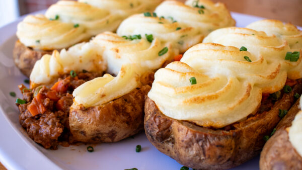 Ingredients 4 large baking potatoes, scrubbed 1 lb ground beef 1 clove garlic, minced 1/2 cup carrots, finely diced 2 tsp tomato paste 1 tsp Worcestershire sauce 1 Tbsp chives...