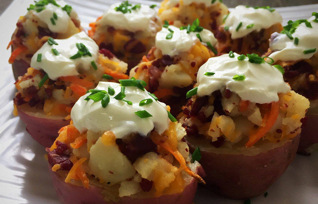 Fill a large pot with water and bring to a boil. Add the potatoes and boil until they are tender. Preheat oven to 400 degrees. After the potatoes have cooled, cut each one in half. Then cut a small slice off the rounded end of each half so the potatoes can sit up. Scoop out the inside of each potato into a bowl. Now add the carrots, cheese, corned beef, and butter to the bowl full of the potato insides you already scooped out. Thoroughly mix all the ingredients together, adding salt to taste. Also, sprinkle some salt over the potato halves. Scoop the mixture into the potato halves and then place them on a baking sheet. Place the baking sheet in the oven for ten minutes. Remove from the oven and serve with a dollop of sour cream and enjoy!