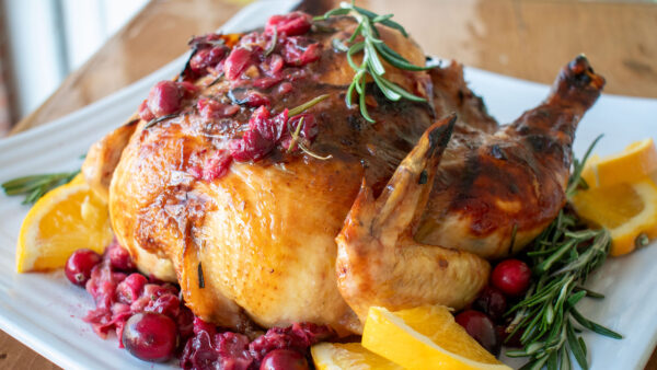 Ingredients 3 lb whole chicken 2 cups cranberries (fresh or frozen) A few sprigs of rosemary 1 large orange Rosemary Balsamic Butter 1/4 cup butter (softened) 1 tsp soy sauce...