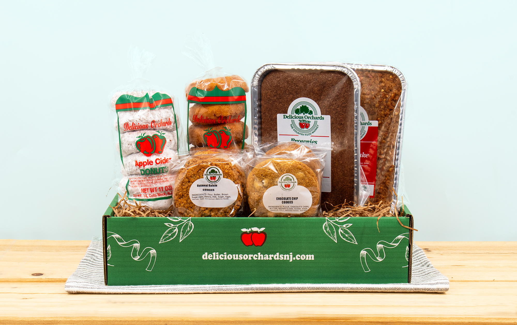 - (6) Powdered sugar Apple Cider Donuts – made with our fresh pressed Apple Cider