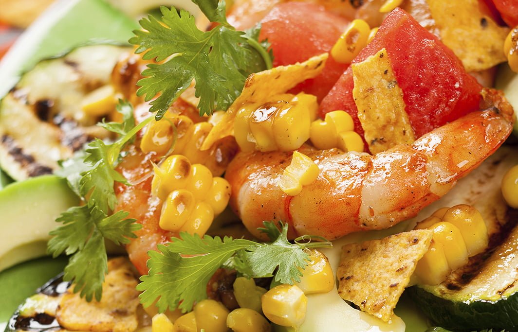 In a large bowl, combine shrimp, fresh corn kernels, green onions, sriracha sauce, garlic, salt and chorizo. Add 1/4 cup chopped basil leaves, 12 each of the red and yellow tomato halves; gently toss to combine. Heat a large skillet over high heat. Add olive oil to pan and swirl to coat. Add shrimp mixture to pan and cook for 4 minutes or until shrimp turn pink, stirring frequently. Place about 1 1/2 cups shrimp mixture in each of 4 shallow bowls and sprinkle each serving with 1/2 teaspoon grated lemon juice, 5 tomato halves and 1 TBS chopped basil.